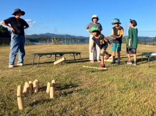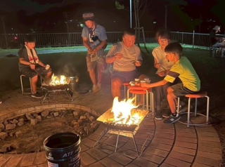 1日目は、テント設営、おやつづくり、モルック、夕食の焼きそばづくり、焚火を行いました。テント設営では、家族で協力してテントを立てました。ひんやりスイーツづくりでは、サイダーの噴水を起こして仕上げるフルーツポンチを作りました。勢いよく噴水が起こると、歓声が上がりました。おやつの後は、モルック体験。モルックは、大人も子どもも楽しめる人気のニュースポーツ。みんなで楽しみました。夕食は、炭火を起こして鉄板で焼きそばづくり。どの家族も、とても上手にできました。「いつもの焼きそばよりも、香ばしくておいしく感じる!」という声も聞かれました。1日目の最後は、焚火です。家族ごとに、焼きマシュマロやドリンクを楽しみながら火を囲みました。夜はテント泊。いつもと違う、テントでの夜を体験しました。