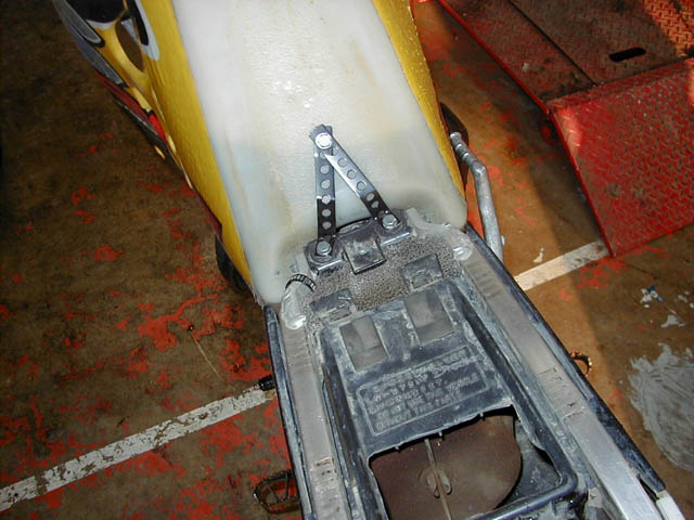 ステーといってもこんなもんです。ま、動かない程度に。 | 写真左下、フレーム部のジェネレーターのオフセット。写真右上ノーマルタンクをマウントしているゴムは取り外し。 |