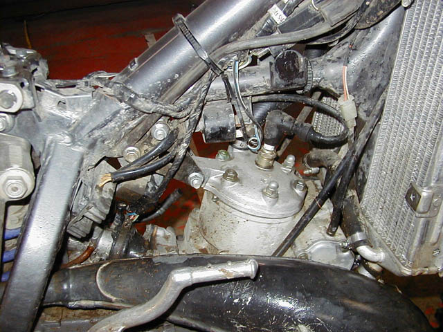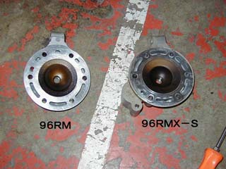 次にパーツの交換です。タンクをフレームに載せた時点で、タンクとシリンダーヘッド(サーモスタット部)が干渉してNG。ここは本誌でもレポートされていたので96RM用のヘッドに交換。RMXとRMではヘッドの形状がかなり異なり、サーモ部が無いだけでなくウオーターラインが変更になるので、ラジエターホース(ラジエターとシリンダーヘッドをつなぐゴムホース)をRM用にします。またサーモの部分の1本だけ、長いスタッドボルトが使われていますので、これも短いボルトに交換です。実物を見て初めて分かったのですが、燃焼室の形状も異なります。見た感じ、RMのヘッドのほうが容積が大きいようです。圧縮比が下がると考えられますので、ついでにレーサーのガスケットに交換します(もっとも、ノーマル状態でほとんど乗ったことが無いので、フィーリングの違いはレポート出来ません・・・)。
