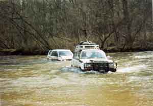 ![]() さっきの続き。4輪もこんな感じです。フロントグリルにカバーをかけて水没対策しています。シュノーケル無しの4輪は牽引してもらったり。ところが、ロシアンジムニーが見事渡ったがために、われらが加藤兄さんのジムニーも渡る羽目に・・。半分流されながら渡ったとか(ちなみに車内浸水あり)。 | ![]() P2東さんはプレスということもあり一番最初に突入。途中でヤバイと思って引き返そうしたのですが、「手伝いますよ」の一言を断れずそのまま渡河して水没・・・。必死のリカバリーで見事復活しました。なお、東福寺さんはマジで渡ったとか。 | ![]() 今日のハードなシーンはさっきの川のみ。ということで、あとは気持ちの良いダートが続きます。ライダーは#12DJEBELXC明前さん。 | |