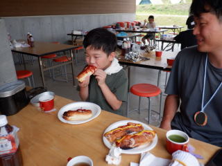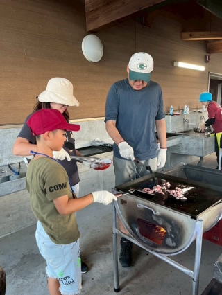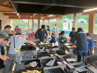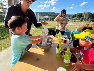 1日目は、テント設営、おやつづくり、モルック、夕食の焼きそばづくり、焚火を行いました。テント設営では、家族で協力してテントを立てました。ひんやりスイーツづくりでは、サイダーの噴水を起こして仕上げるフルーツポンチを作りました。勢いよく噴水が起こると、歓声が上がりました。おやつの後は、モルック体験。モルックは、大人も子どもも楽しめる人気のニュースポーツ。みんなで楽しみました。夕食は、炭火を起こして鉄板で焼きそばづくり。どの家族も、とても上手にできました。「いつもの焼きそばよりも、香ばしくておいしく感じる!」という声も聞かれました。1日目の最後は、焚火です。家族ごとに、焼きマシュマロやドリンクを楽しみながら火を囲みました。夜はテント泊。いつもと違う、テントでの夜を体験しました。