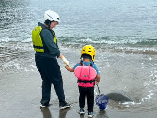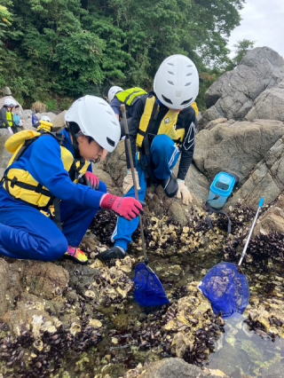 2日目。朝食は「カートンドッグ」です。具をはさんだコッペパンを牛乳パックに包んで火をつけ、温めるだけの簡単キャンプご飯!こんがり美味しいホットドッグができました。ご飯の後は、テントを撤収して磯遊びへ。石浜海岸の砂浜や磯で生き物を探しました。カニや、小さな魚、ヤドカリ等、海の生き物に子どもたちは夢中です。