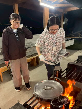 所に戻り、夜ご飯の準備。かまどで、飯ごうと鍋を使って作りました。メニューは「松茸風味のキノコご飯」「芋煮鍋」。参加者の皆さんで協力して、おいしい夕ご飯が出来ました。これにプラスして、スタッフが焼き上げた「ホタテ」「さんま」そして、釣ってきた「イワシ」も召し上がってもらい、お腹も心も充実していただきました。