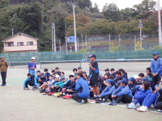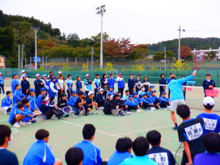 講師を務めたのはヨネックス株式会社の小松芹奈選手です。また、岩手県立高田高等学校の女子ソフトテニス部の皆さんや各学校の指導者の皆さん、顧問の先生方にも球出しなどに協力していただきました。