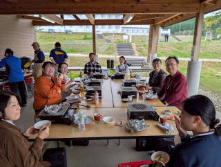 所に戻り、夜ご飯の準備。かまどで、飯ごうと鍋を使って作りました。メニューは「松茸風味のキノコご飯」「芋煮鍋」。参加者の皆さんで協力して、おいしい夕ご飯が出来ました。これにプラスして、スタッフが焼き上げた「ホタテ」「さんま」そして、釣ってきた「イワシ」も召し上がってもらい、お腹も心も充実していただきました。