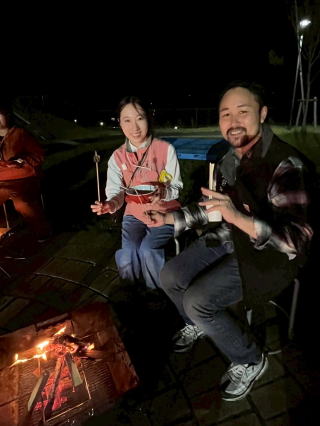 1日目の最後を飾るのは、キャンプの醍醐味「たき火タイム」。竹筒ホットケーキや焼きマシュマロをつまみながら、暗闇の中、炎の明かりとともに、ゆったりとした大人時間が流れていました。